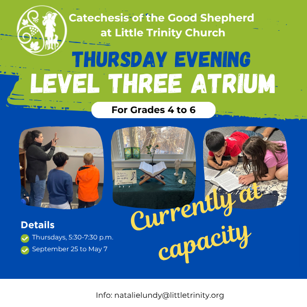 Little Trinity Church has long been a community that welcomes and deeply values children. Our Children’s Ministry aims to lead children and their families to prayer, a deeper understanding of Scripture, fuller participation in the life of the Church, and a hope born of sure knowledge of God’s plan and their place in that plan.