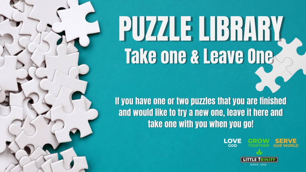 The best part of puzzling is fitting the pieces together, but when that puzzle is done you want something new! Bring your puzzle to our new puzzle library (by the book shelves at the back of the Parish Hall) and take one of the ones you haven’t tried yet! It’s a bring one and take one system that will allow us to all to share our puzzles with each other!