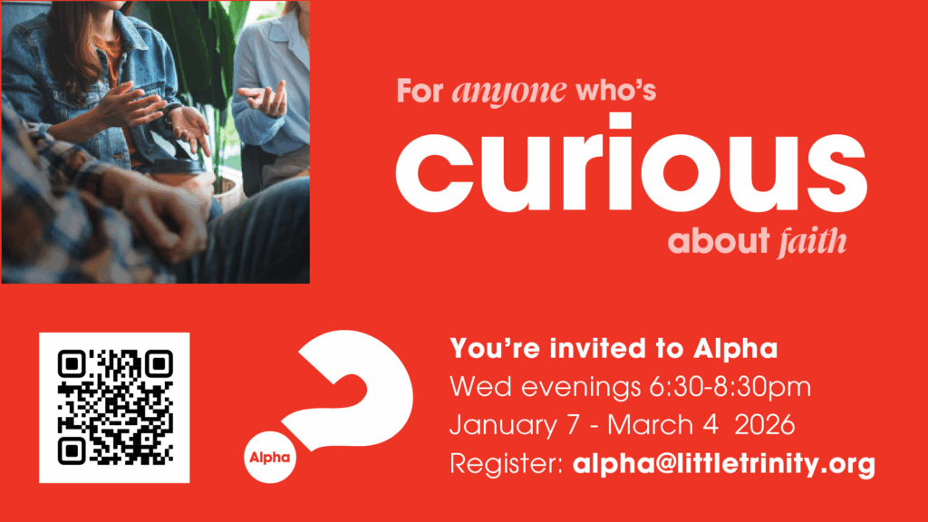 Coming in January 2026 – Alpha encourages conversation about life’s big questions by exploring the foundations of our faith. If you or a neighbour or co-worker are curious about Christianity, start talking to them about Alpha at Little T!