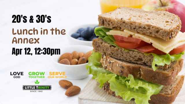Coming up we will be holding 20s/30s Group lunches and various events. Our lunches will be held upstairs in the Annex – 403 King Street West. They’ll happen at the Annex after the second service (10:45 am) around 12 pm unless otherwise stated. For other events, stay tuned about where and when they happen!