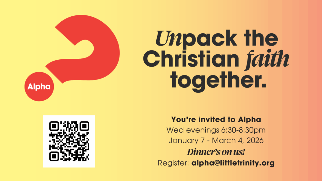 If you or a neighbour or co-worker are curious about Christianity, start talking to them about Alpha at Little T! Each session begins with dinner at 7pm, followed by a video and discussion, ending by 9pm. Mark your calendar for our next course starting Wednesday, Jan 7 and runs until March 4, 2026.