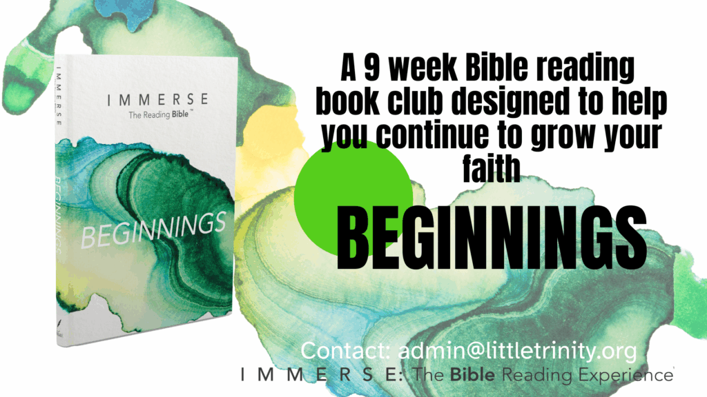 The Immerse BEGINNINGS Course – Due to popular demand the Immerse Bible reading course is back this fall and has started. The course is 9 weeks and involves reading the Bible in an accessible book club format. This time we will be Immersing ourselves in the first 5 books of the Bible in the ‘Beginnings’ volume. You’ll get your own (free) Immerse book and be invited to do some reading each week (either from the actual book or via a streamed audio version). And like real book clubs, it doesn’t matter if you finish your reading; just come and discuss! Find out more on the Immerse Bible Website HERE.
