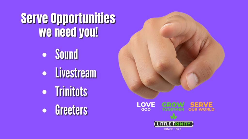 Volunteering and serving is a large part of being involved in Little Trinity. All three services have multiple ministries supporting and facilitating everything from children and youth programming, to greeting, to running the soundboard during a service. If you would like to be involved, please text the text-to-serve number below and chat with Laurie, our Volunteer Coordinator to find out where you could serve!