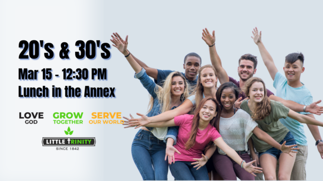 Sun, Mar 15, 12:30pm, Little T Annex – If you are in your 20’s or 30’s, join us for lunch after the 10:45am service on Feb 8. We will have […]