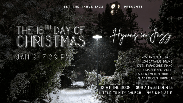Fri, Jan 9, 7:30pm, Little Trinity Church – Set the Table Jazz presents “The 16th Day of Christmas,”  Join Silas Friesen, Nick Arseneau, and special guests for an evening of reimagined hymns, […]