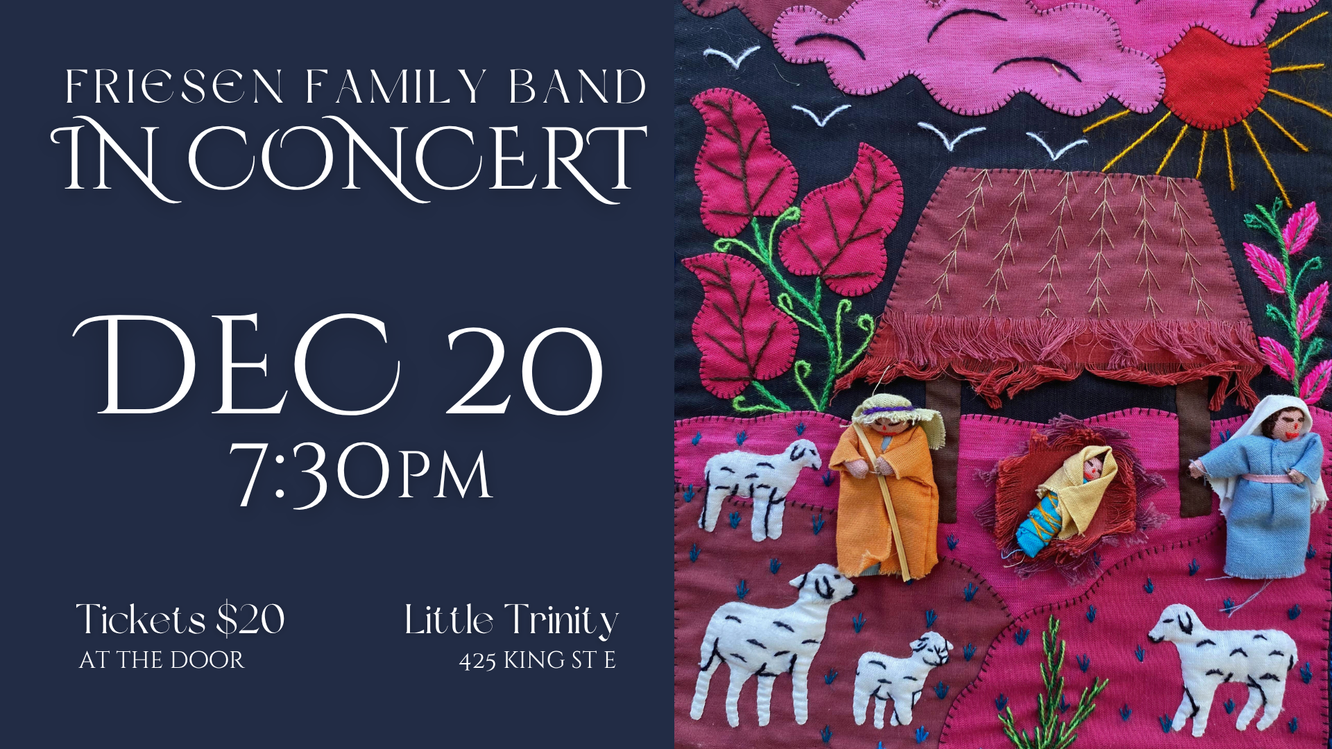 Little Trinity Church 425 King St. East, Toronto, Ontario, CanadaSat, Dec 20, Little Trinity Church – Friesen Family Band in Concert: Join Chris and Louise, their six children and spouses, for an evening of Christmas-facing music featuring voices, strings, guitars, winds, piano, percussion, and more. From transformed carols to original songs in folk, jazz, and classical genres, this eclectic concert will offer inspiration for every musical taste, […]