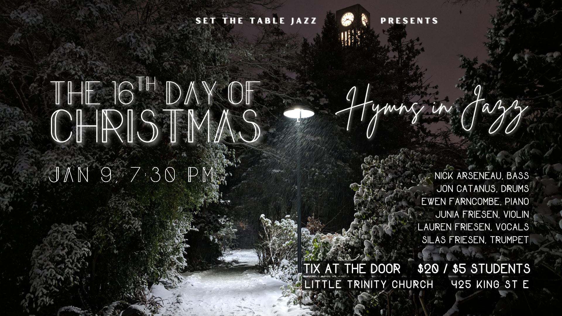 Little Trinity Church 425 King St. East, Toronto, Ontario, CanadaFri, Jan 9, 7:30pm, Little Trinity Church – Set the Table Jazz presents “The 16th Day of Christmas,” Join Silas Friesen, Nick Arseneau, and special guests for an evening of reimagined hymns, reflective readings, and brand-new music, creatively meditating together on the journey of faith in the season of Epiphany. Tickets available at the door ($20; Students […]